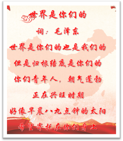 宣誓仪式结束后,校党支部书记刘琴讲话,提出了对新老团员和全体学生的要求:“希望我们日升中学的共青团员们、学子们不辜负我们敬爱的老一辈无产阶级革命家的殷切期望;不辜负以习近平总书记为核心的党中央的殷切期望。把自己培养成热爱中国共产党、热爱社会主义祖国,永远跟党走的德、智、体、美、劳全面发展的社会主义事业的建设者和接班人。”并带领全校师生欣赏伟大领袖毛泽东同志对青年寄托无限希望的一段语录谱写的一首歌曲《世界是你们的》。